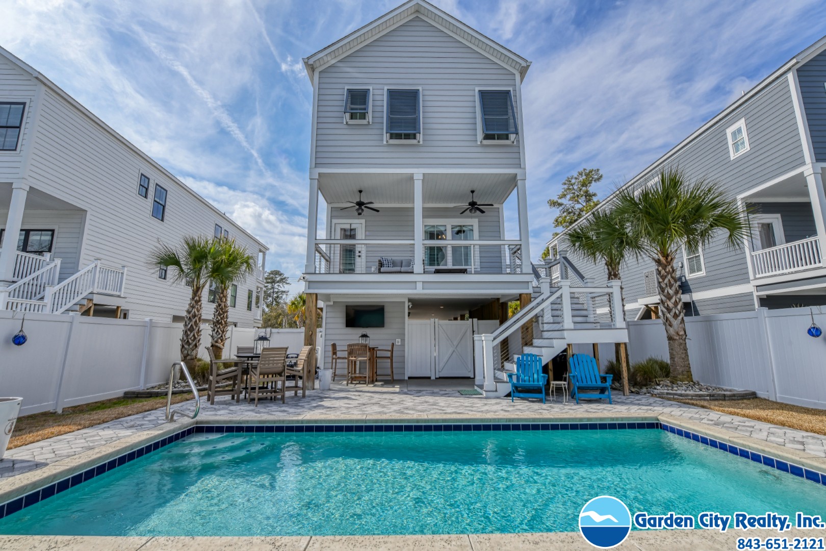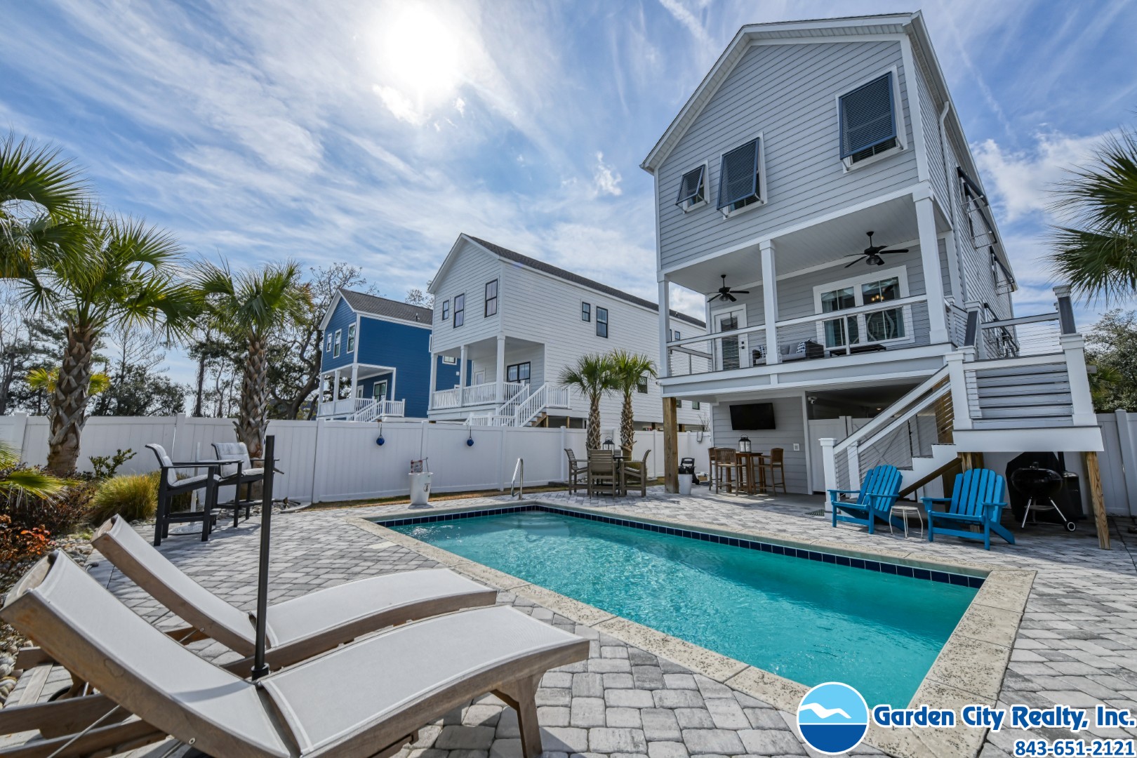 All Aboard Beach House is a five-bedroom, five-and-a-half-bath house located 1.1 miles northwest of Garden City Pier, and a short walk to public beach access. This property features a fully-equipped kitchen complete with stainless steel appliances including a microwave and dishwasher. Other features include a washer, dryer, central heating and air conditioning, and ceiling fans throughout. Six TVs and Wi-Fi are also provided. Sleeping accommodations include one king, two queen, and two double-sized beds. Outdoor amenities include a private swimming pool, pool furniture, charcoal and gas grills, and outdoor shower. Permits motorcycles. Permits trailers. No smoking. Maximum occupancy: 10