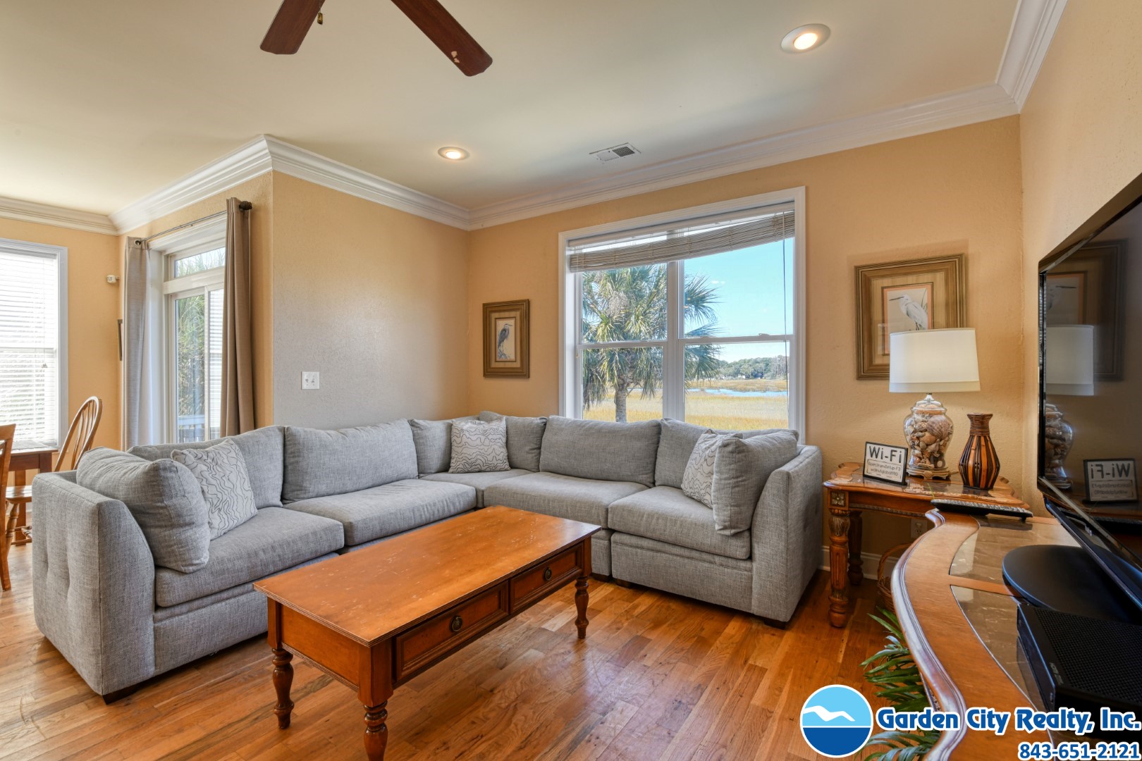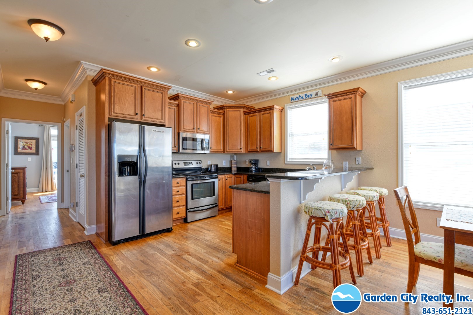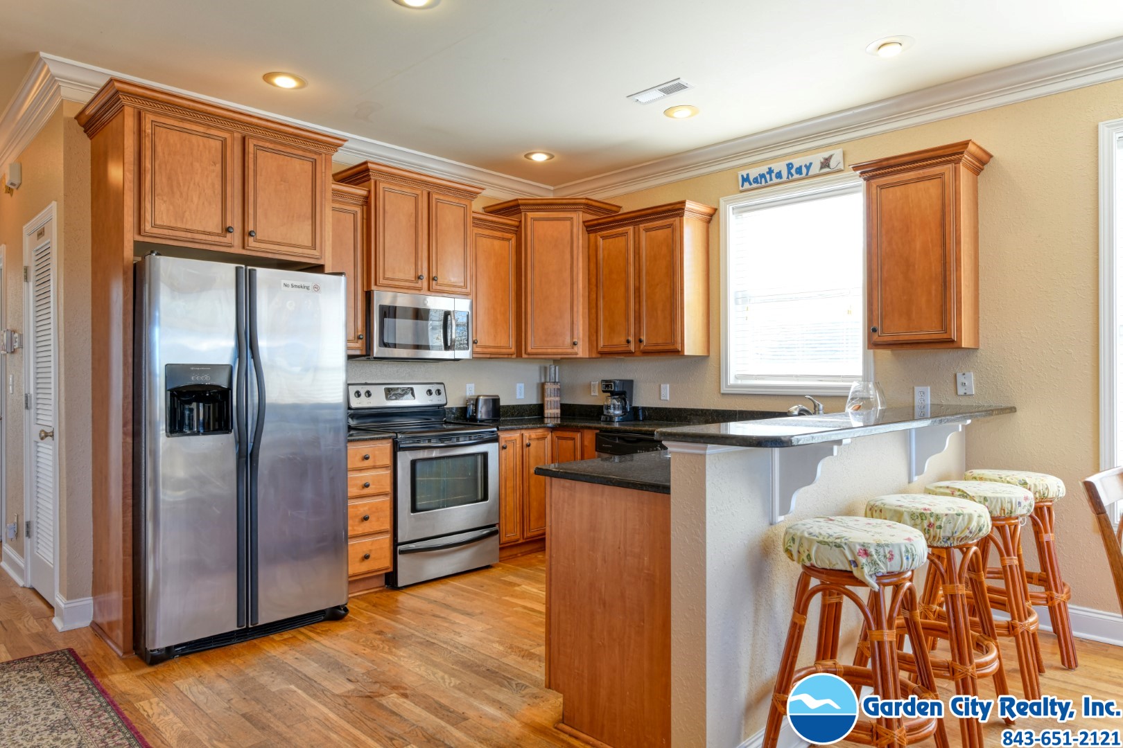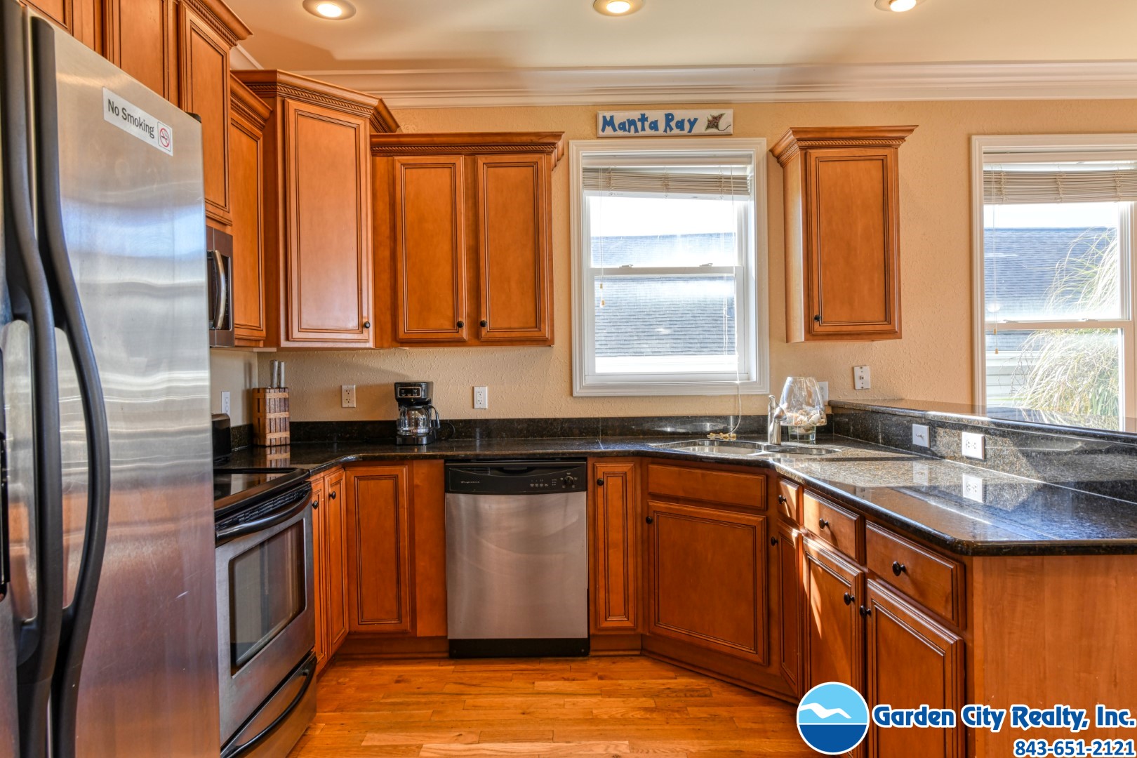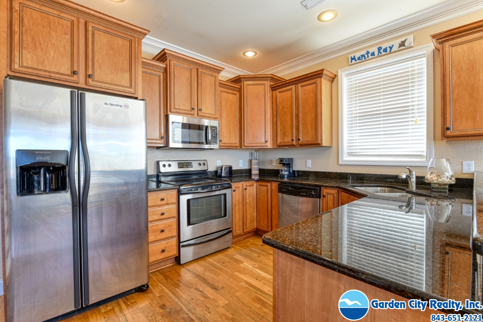Manta Ray Mansion is a five-bedroom, five-and-a-half bath channel-front duplex located 0.2 miles north of Garden City Pier. This ocean view property features a fully-equipped kitchen complete with stainless steel appliances including a dishwasher and microwave, hardwood floors throughout, washer, dryer, central heat and air conditioning, and ceiling fans. Six TVs (cable, five flat screen), DVD player, high speed Internet, and Wi-Fi are also provided. Sleeping accommodations include two king, one queen and one twin-sized bed, two twin-over-double bunk bed sets, plus a queen sofa bed. The outdoor living space features a private 12-by-19-foot swimming pool, covered porches, outdoor shower, grill, and ample parking (some covered). The channel is empty at low tide and is not navigable. This property does not have ocean access by boat. This property is a duplex. No fireworks. No smoking. No pets. Maximum occupancy: 15