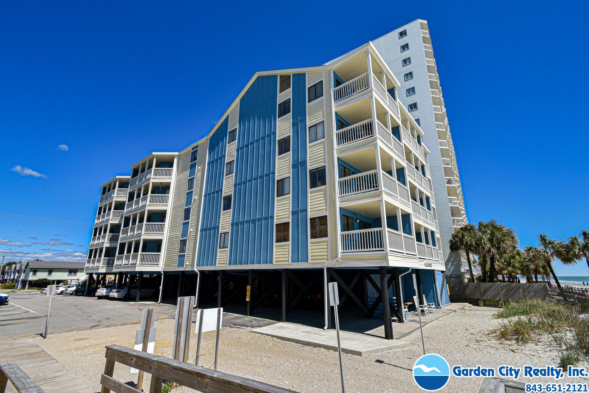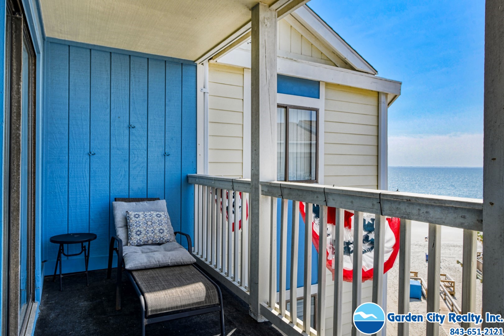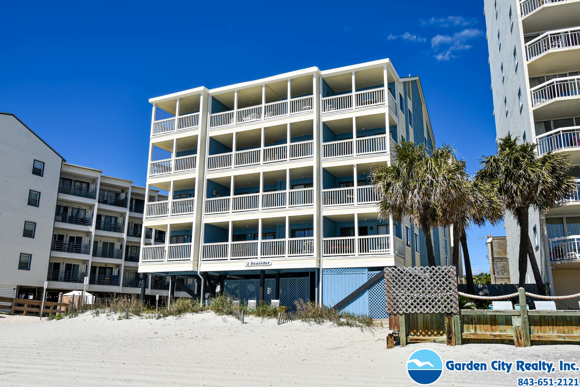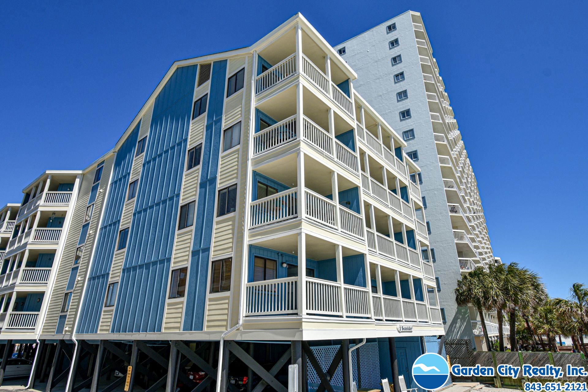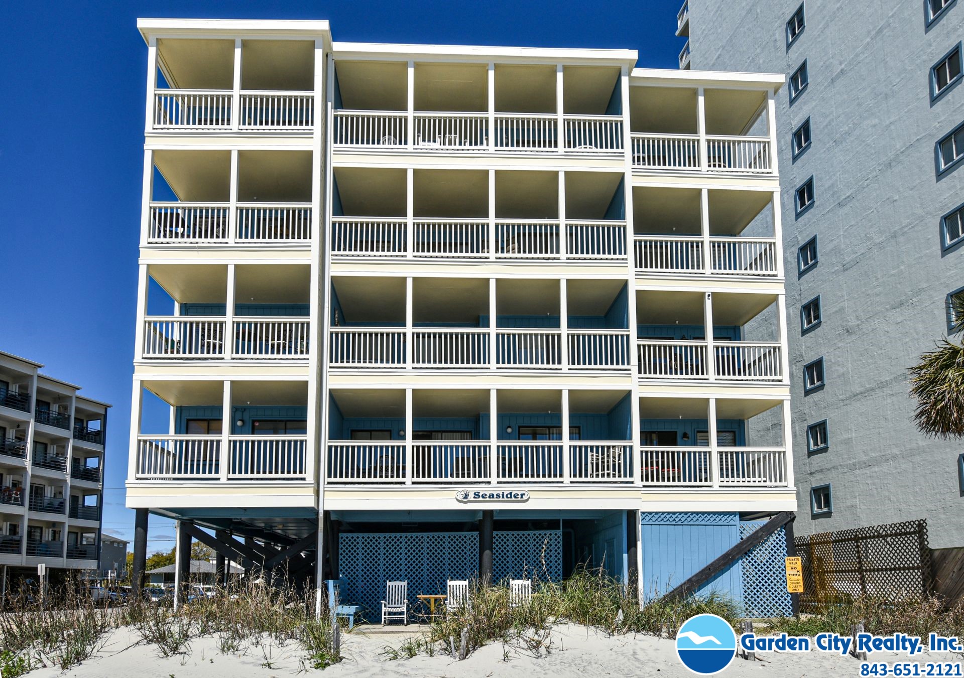Seasider 405 is a three-bedroom, three-bath ocean view condo located 0.6 miles north of Garden City Pier. This unit features a fully equipped kitchen complete with a dishwasher and microwave, as well as a large private and furnished ocean-view balcony, washer, dryer, central heating and air conditioning, and ceiling fans. Four flat-screen TVs (cable), a DVD player, and Wi-Fi are also provided. Sleeping accommodations include two queen and two twin-over-double bunk beds, plus a double-sized sofa bed. The complex is oceanfront, but the unit is not. Elevator. No pool. Parking is limited. No trailers. No golf carts. No pets. No smoking. Maximum occupancy: 8