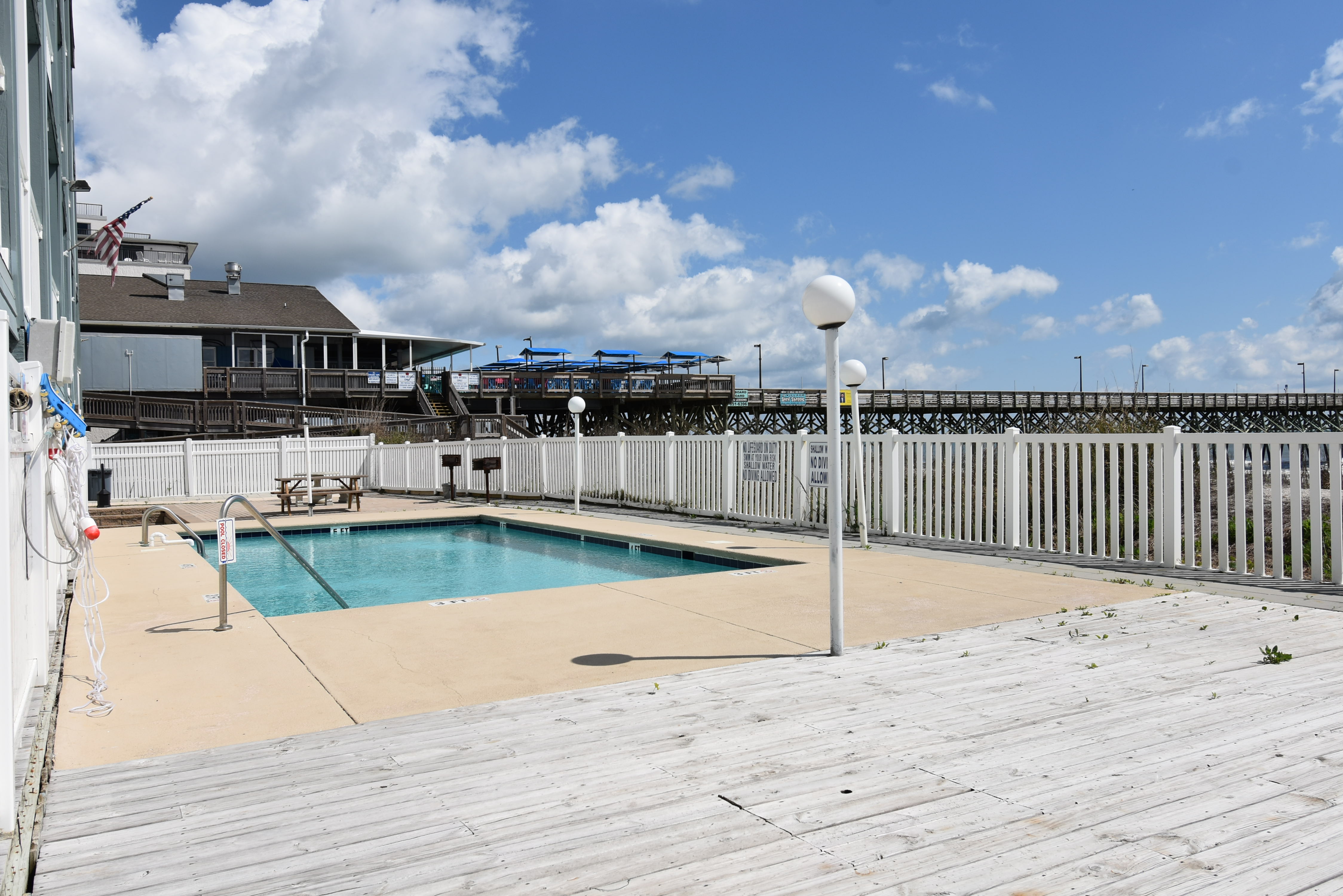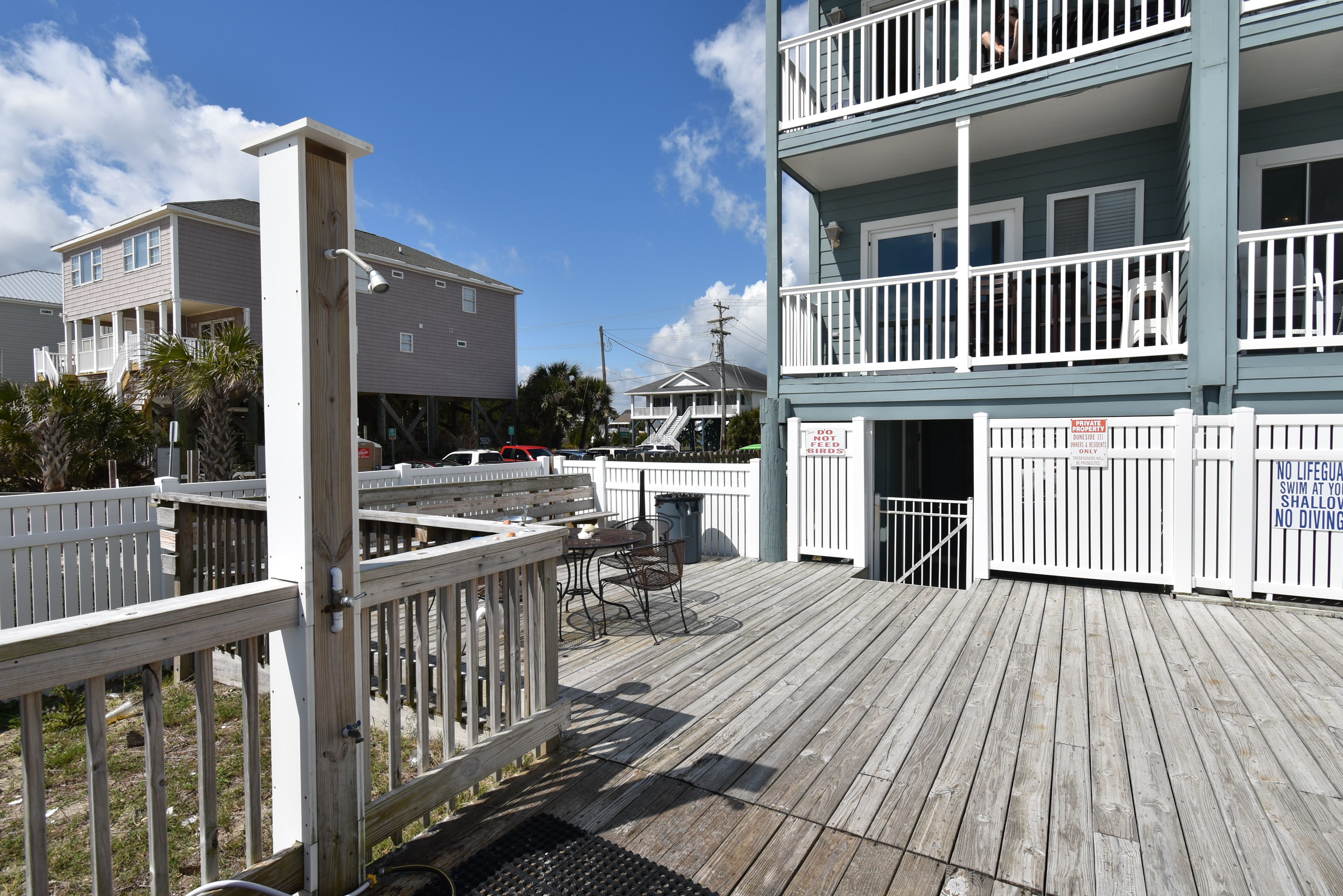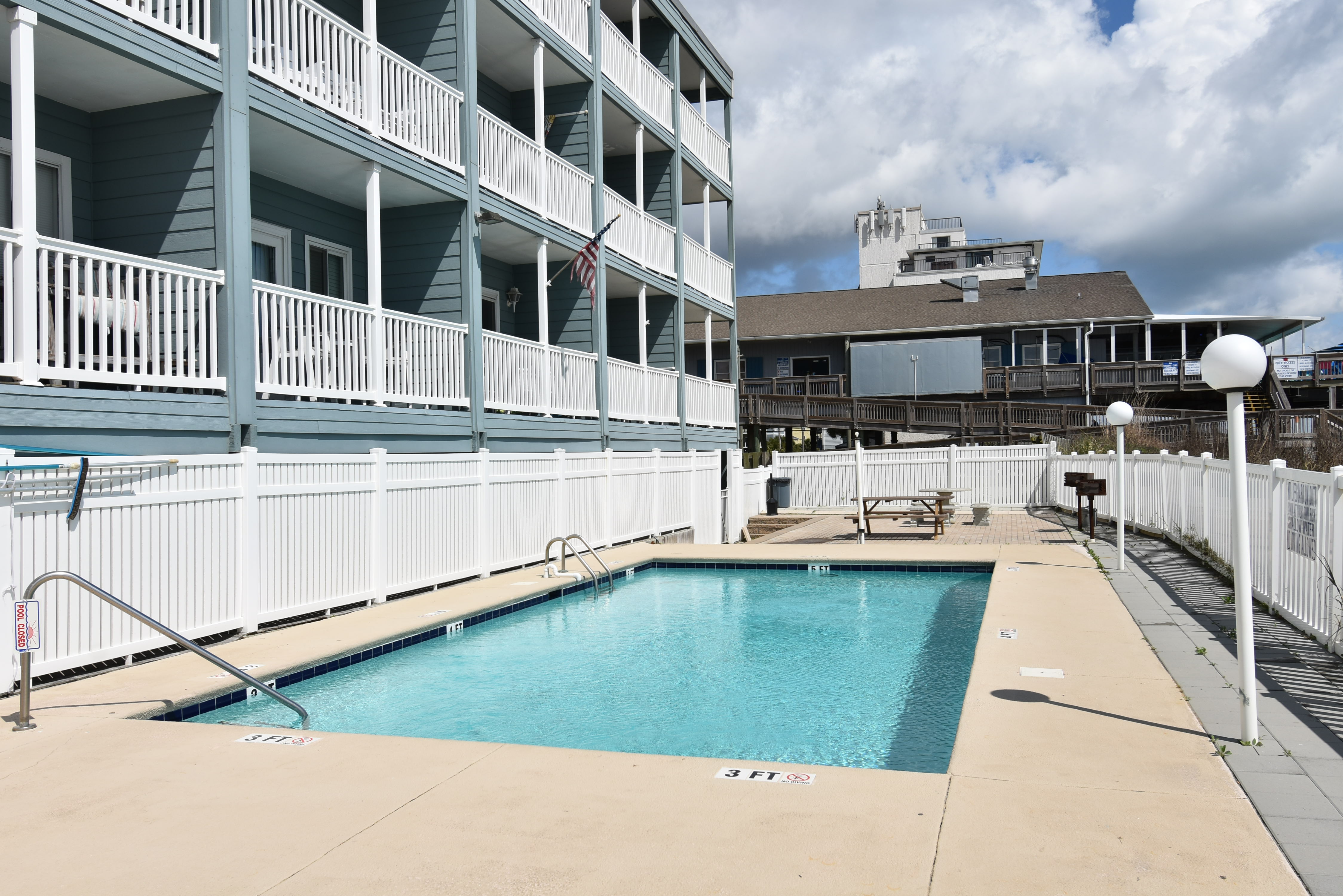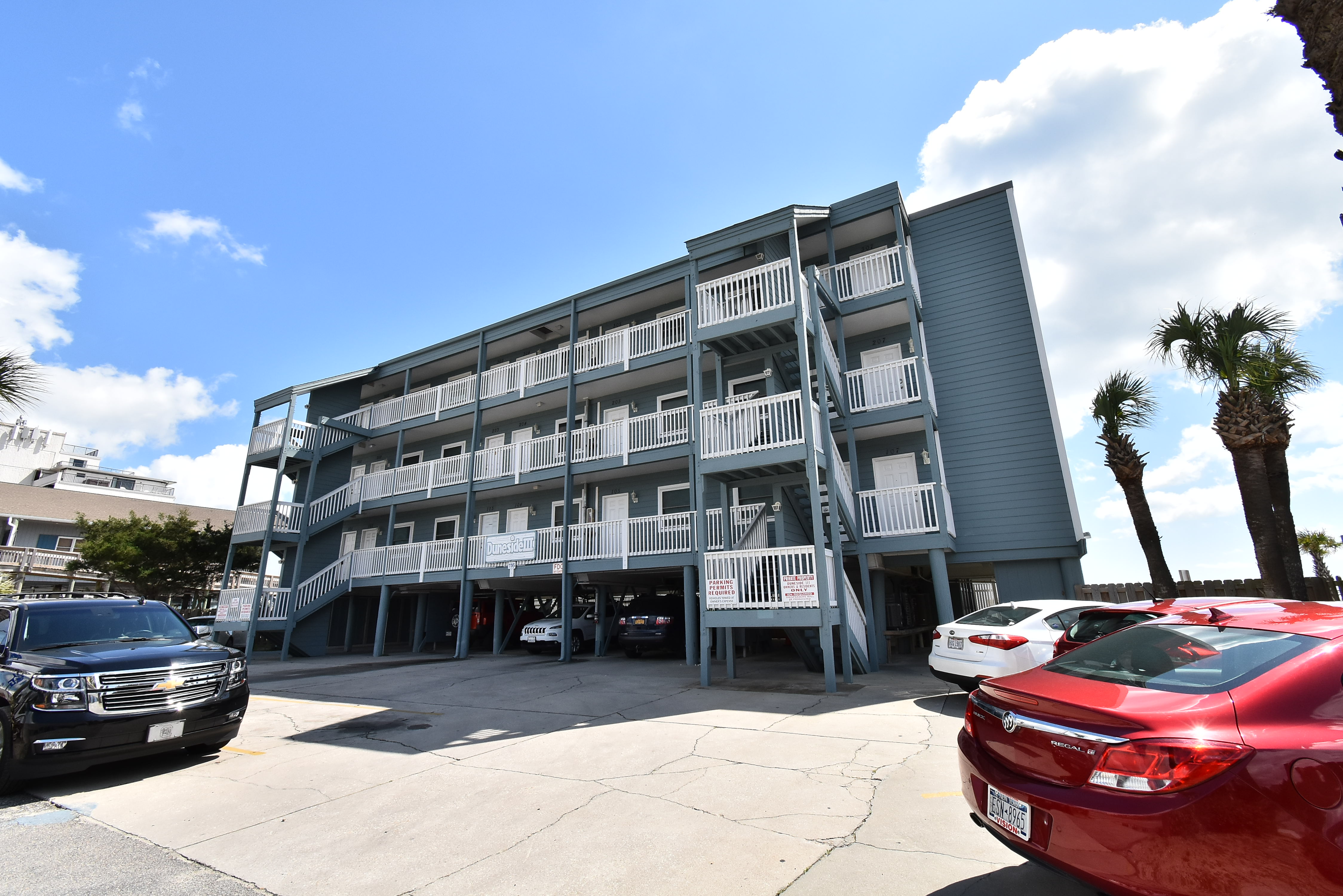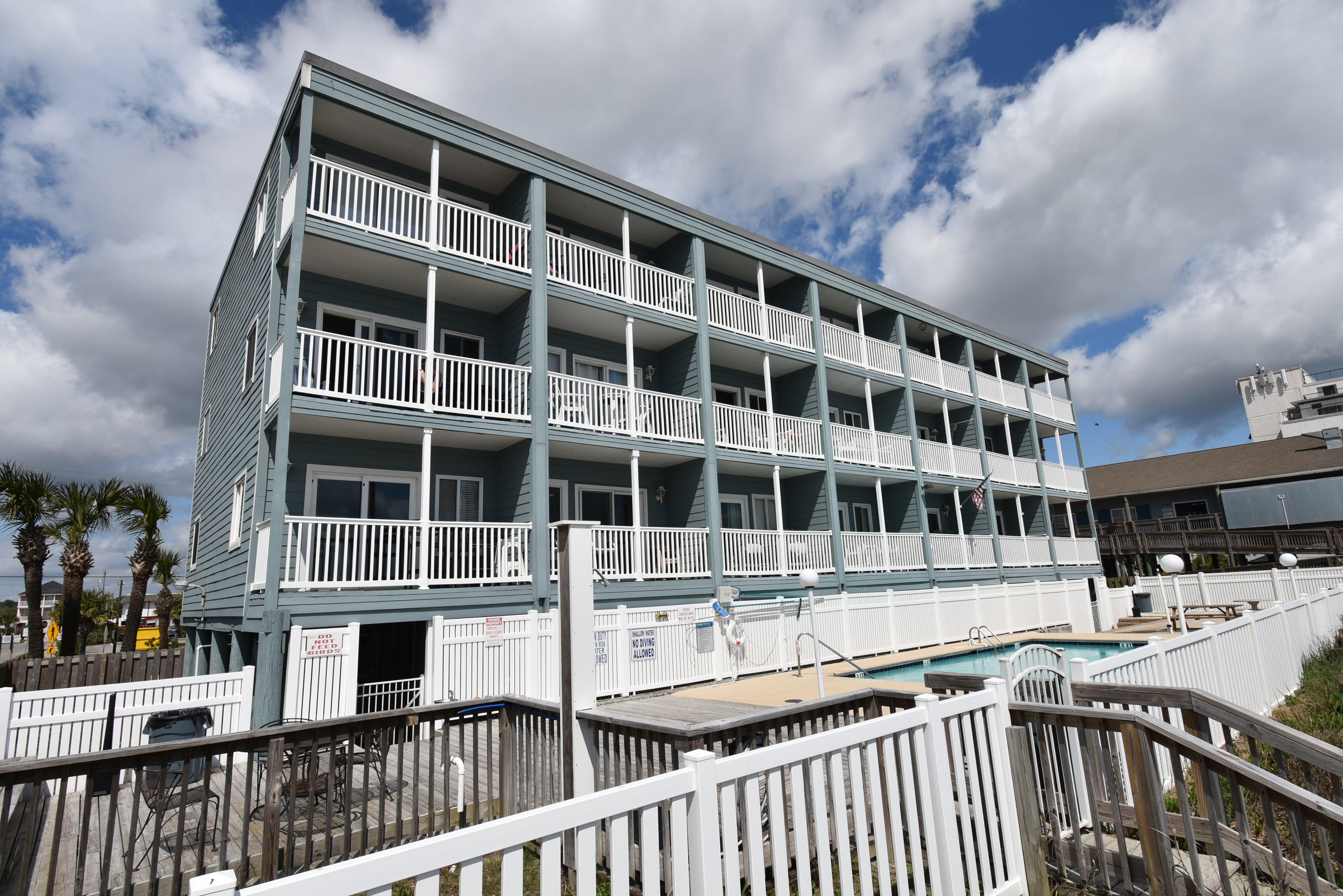 Duneside III is an oceanfront complex comprised of one-bedroom, one-bath condo suites located 0.1 miles south of Garden City Pier, directly facing the ocean. Standard unit features include a fully-equipped kitchen, central heat and air conditioning, covered balcony, and ocean views. Other interior features and amenities vary per unit. Complex amenities include a swimming pool and coin-operated laundry. Limit one parking pass per unit. No elevator. No trailers. No golf carts. No pets. Check-out maid service included.