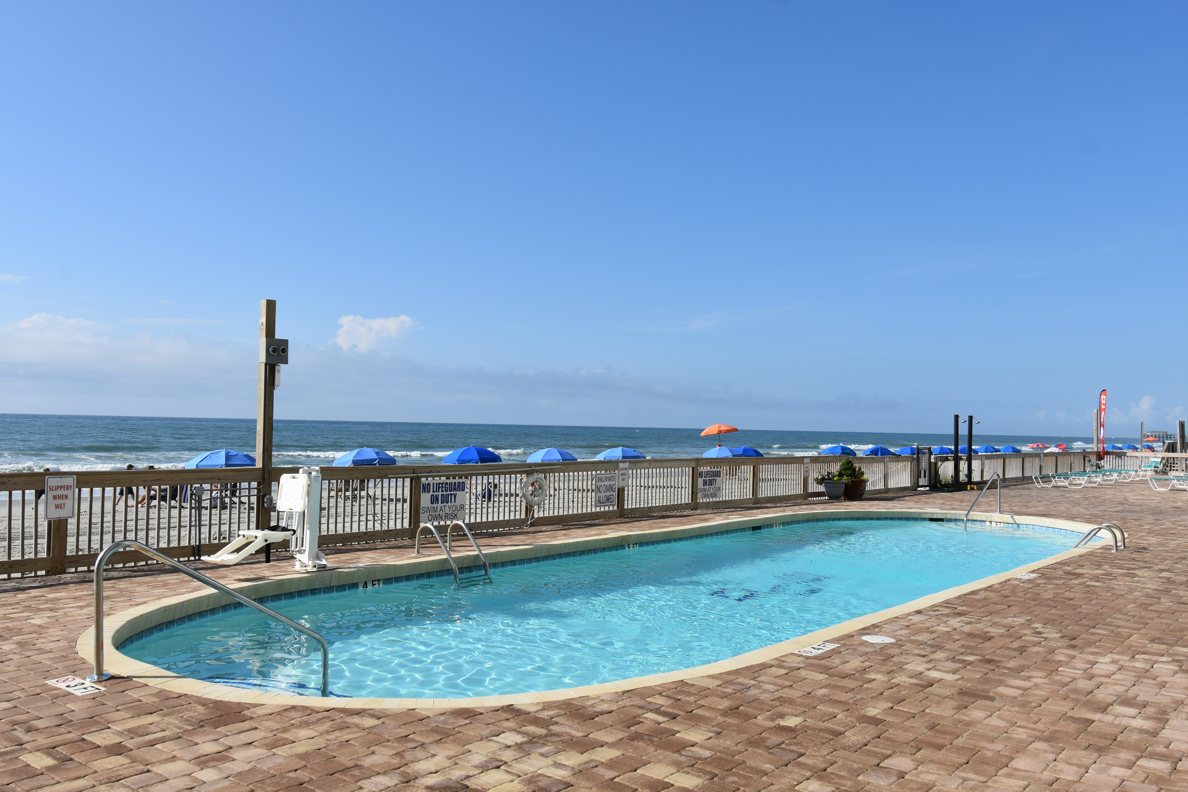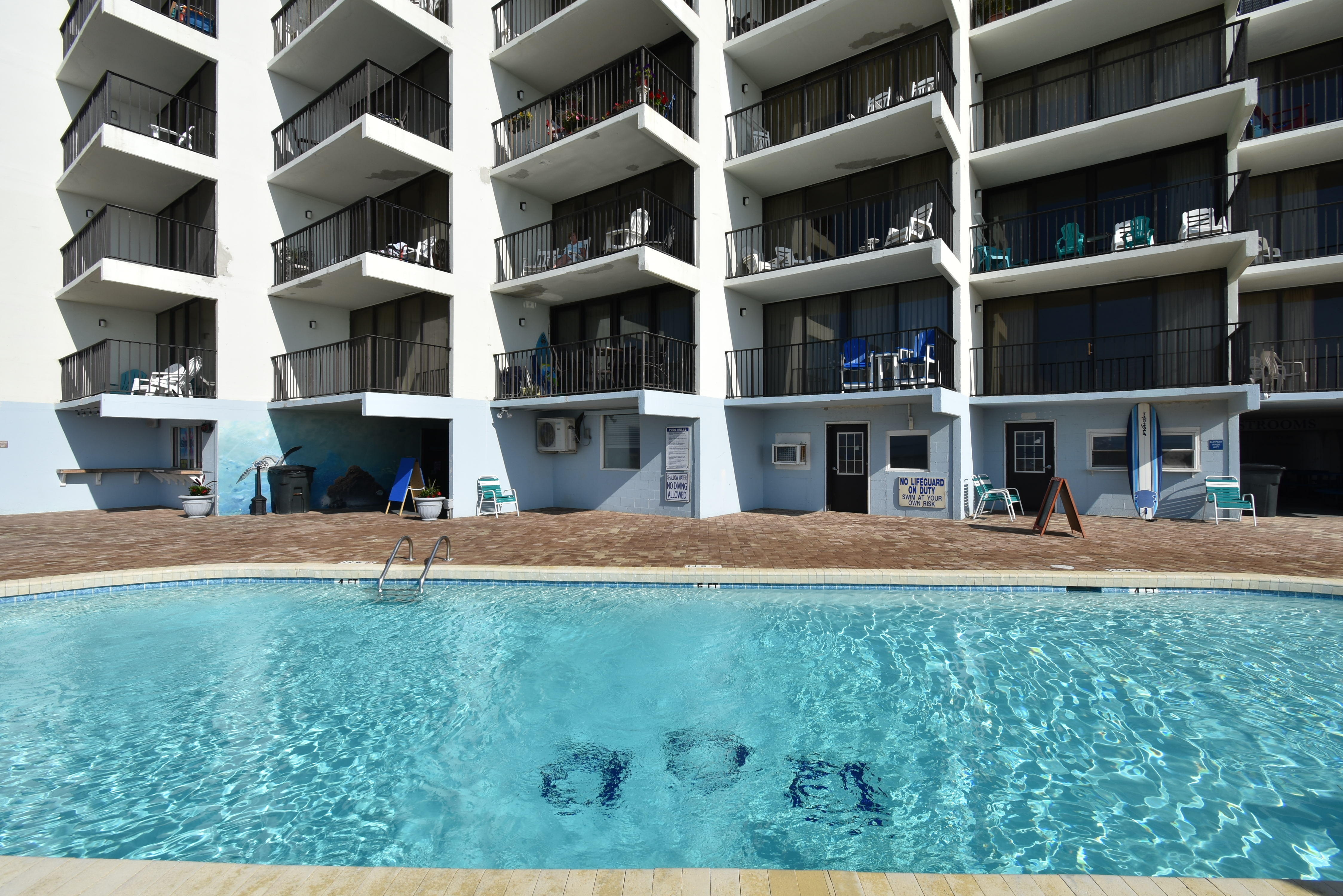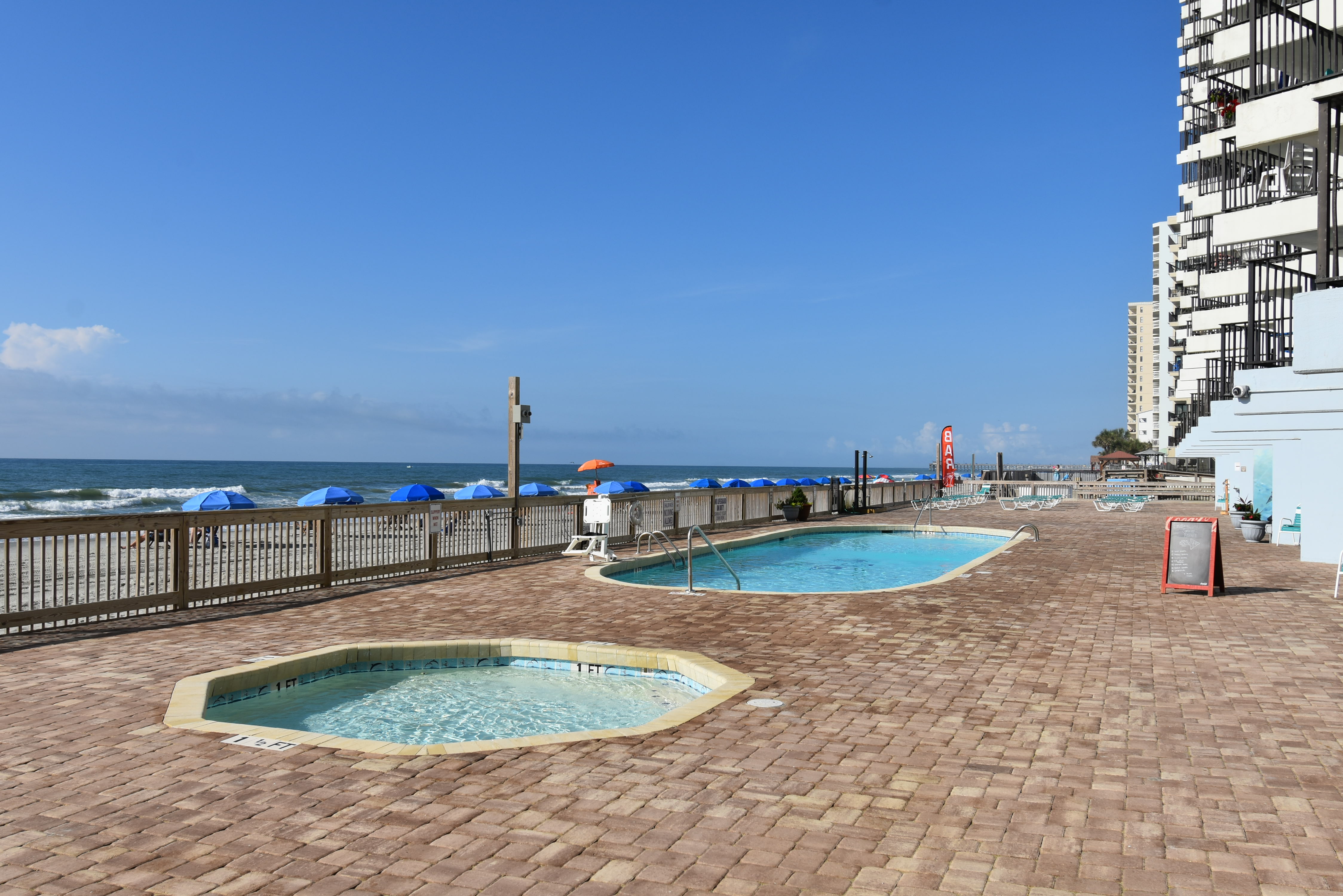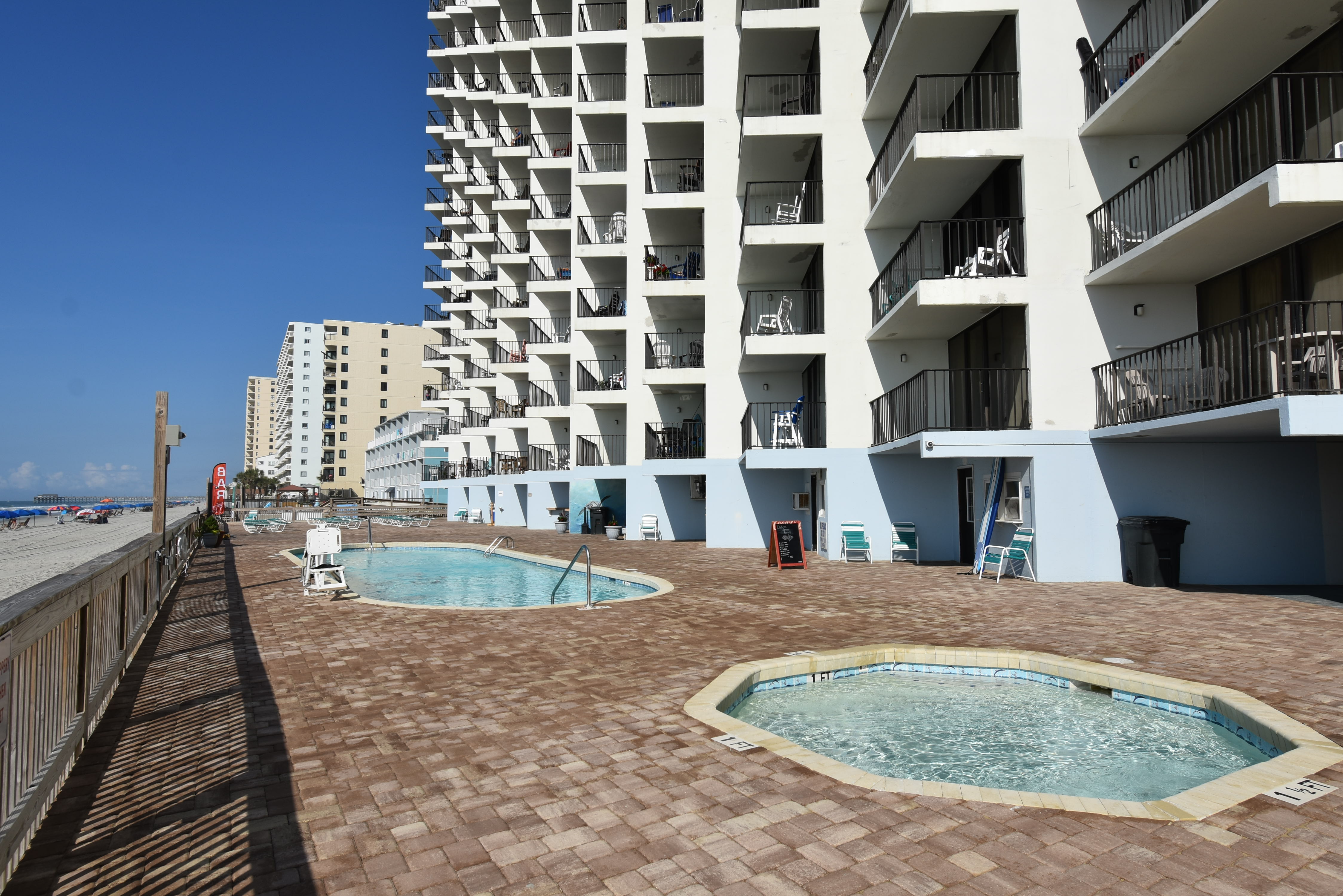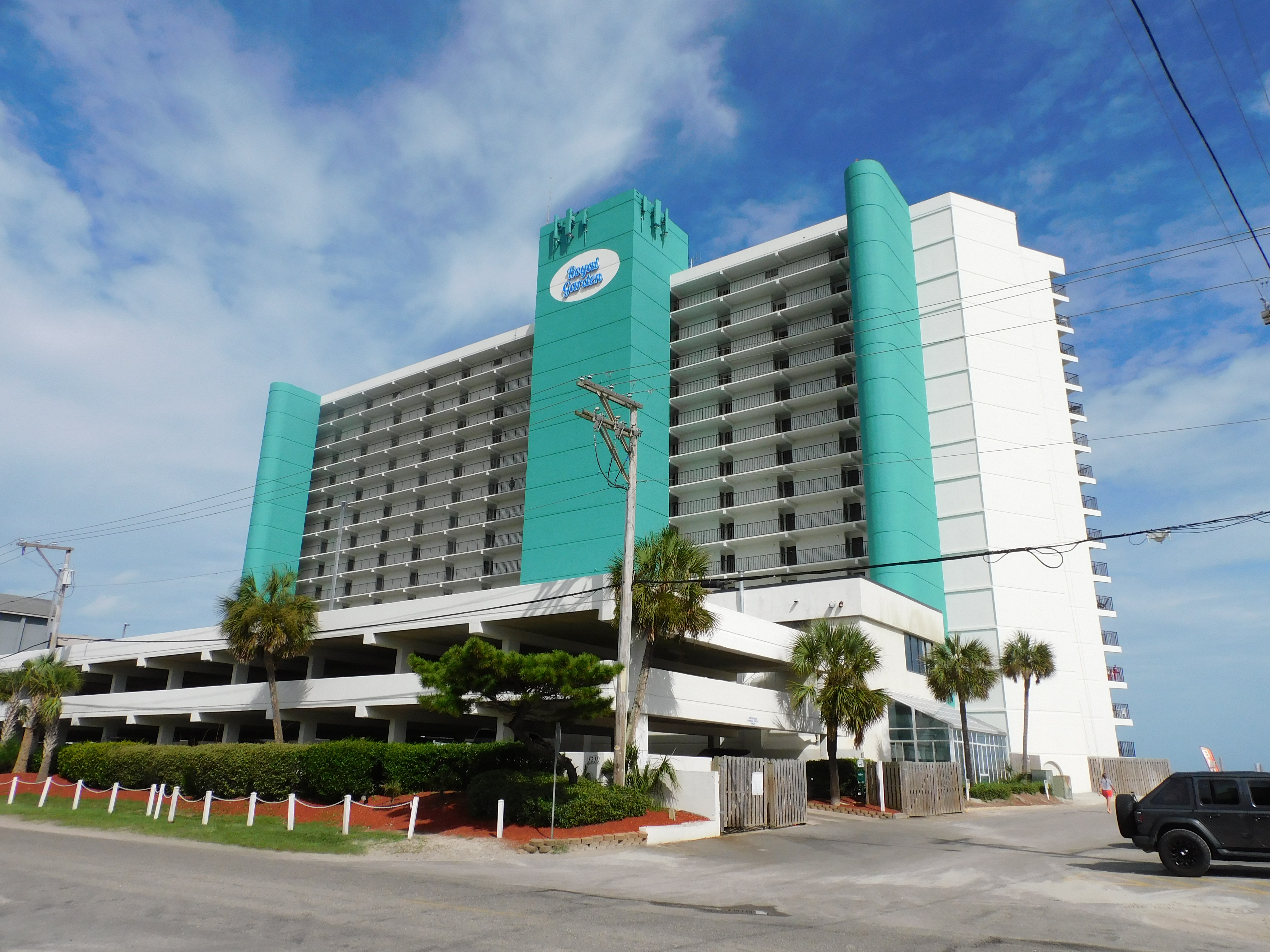 Royal Garden Resort is an oceanfront complex comprised of two-to-three-bedroom, one, two, and two-and-a-half-bath condo suites located 0.7 miles north of Garden City Pier. Standard unit features include a fully-equipped kitchen, central heat and air conditioning, and oceanfront balcony. Other interior features and amenities vary per unit. Complex amenities include an indoor and outdoor swimming pool, hot tub, sauna, kiddie pool, restaurant and lounge, covered parking, and three elevators. Parking passes limited to two per unit. No golf carts. No trailers. No pets. Check-out maid service included.