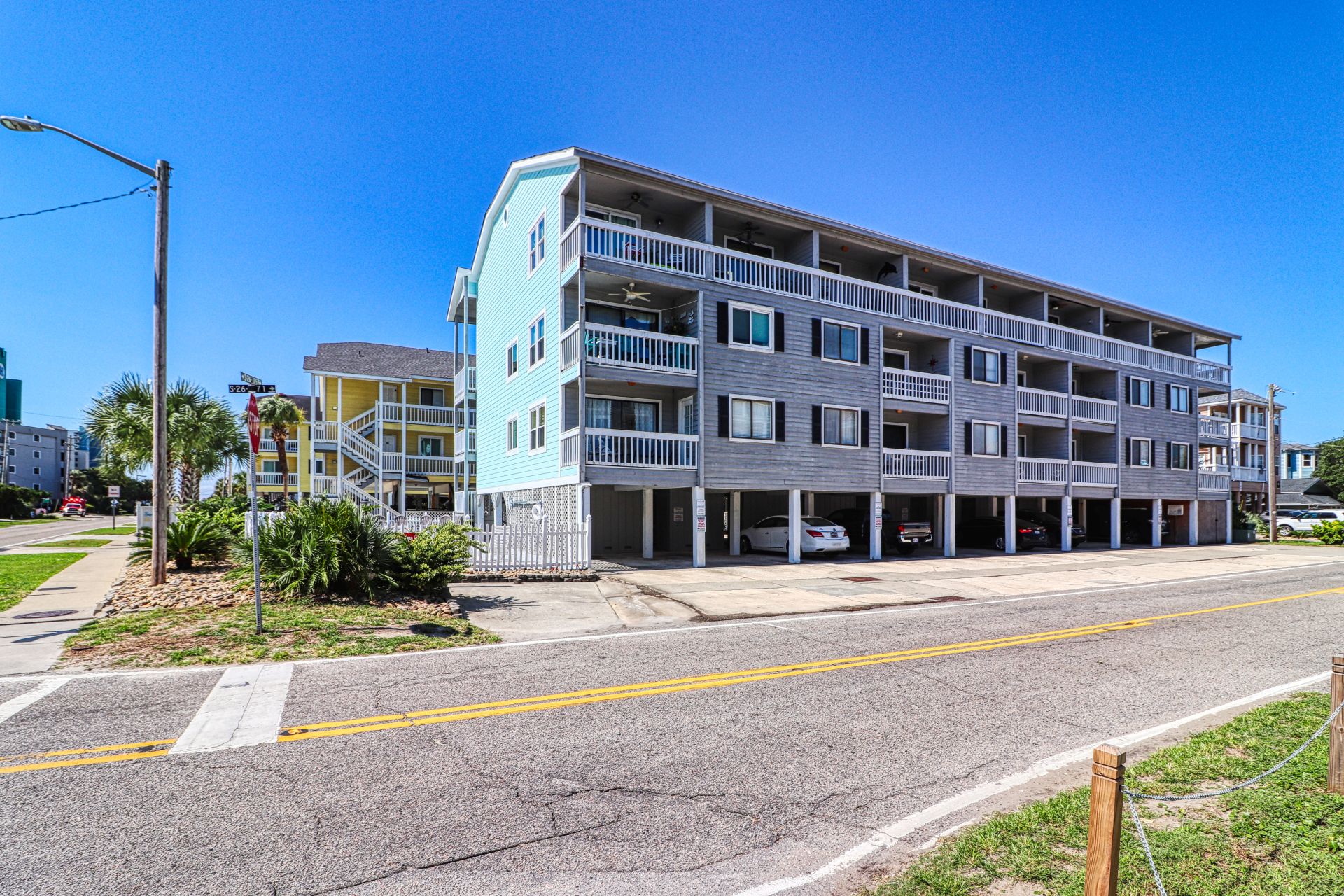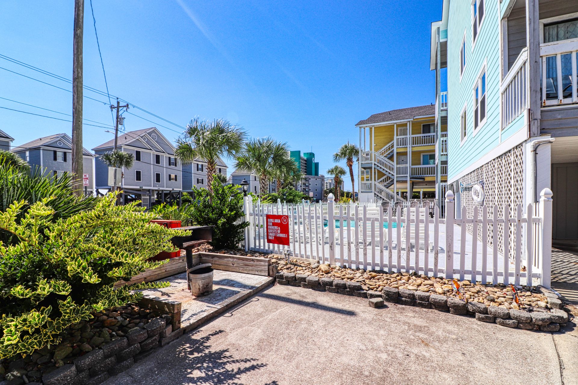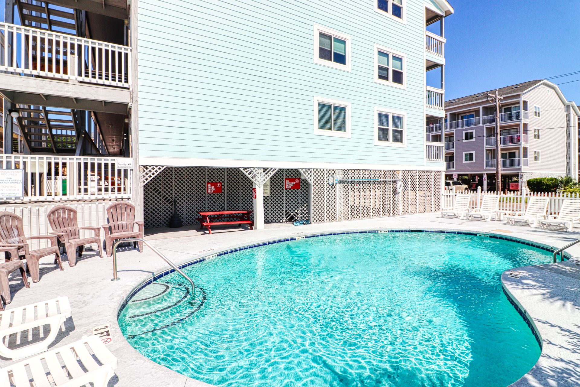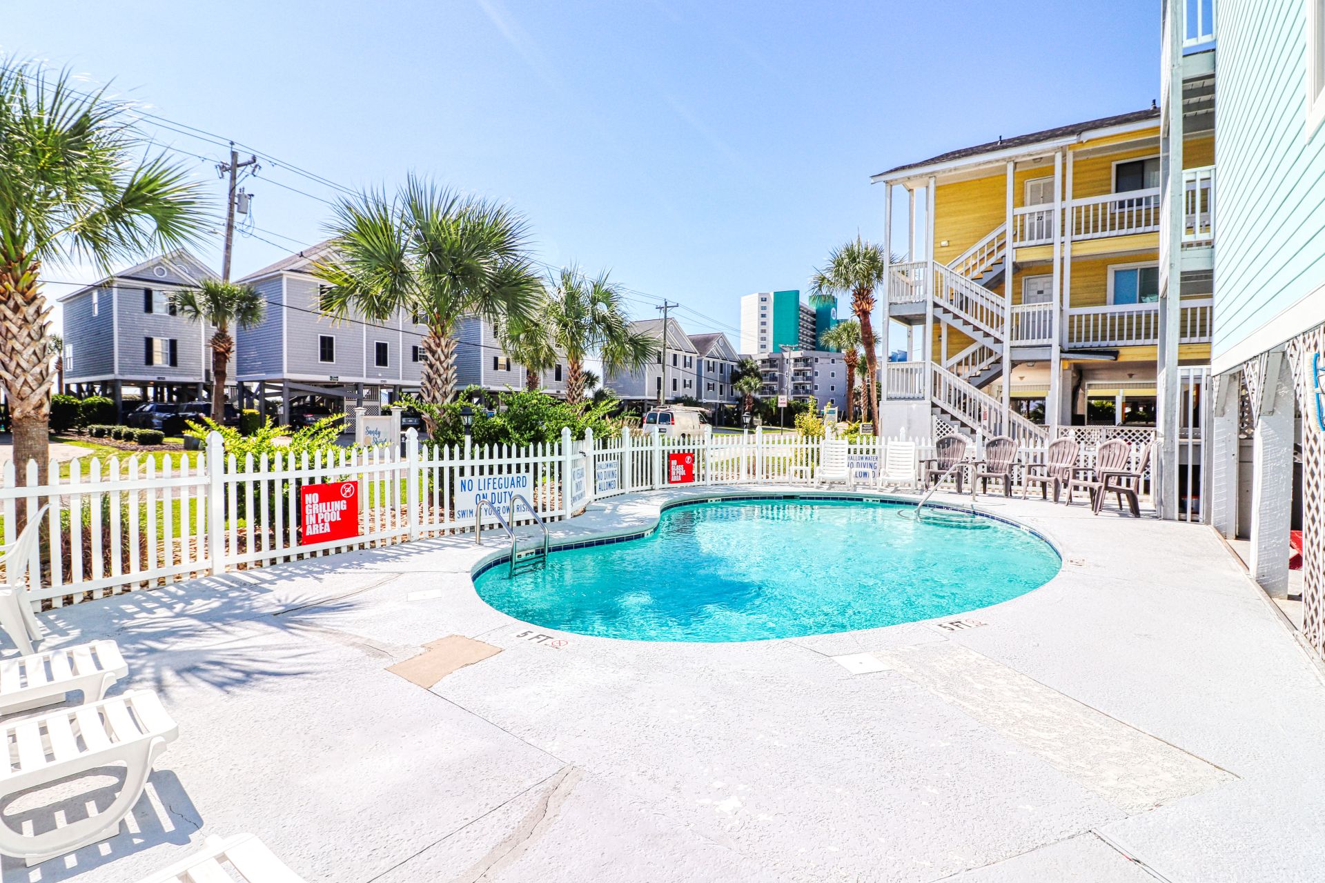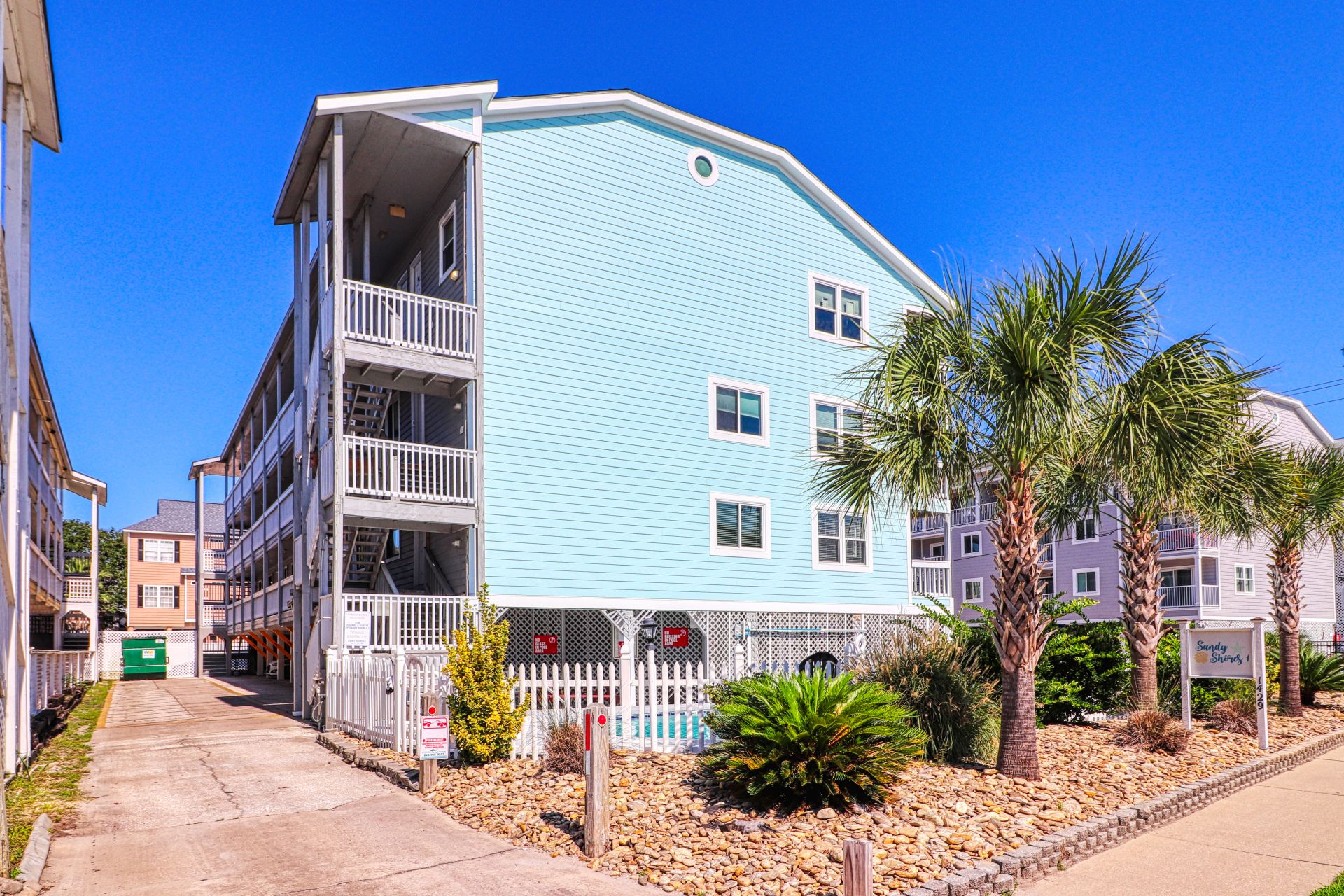 Sandy Shores I is a second-row complex comprised of two-to-three-bedroom condo suites located 0.8 miles north of the Garden City Pier. Standard unit features include a fully-equipped kitchen, central heat and air conditioning, and balcony, and ocean views. Other interior features and amenities vary per unit. Complex amenities include a full-sized swimming pool, outdoor shower, and professionally landscaped grounds. Limit one parking pass per unit. No elevator. No golf carts. No trailers. No smoking. No pets. Check-out maid service included.