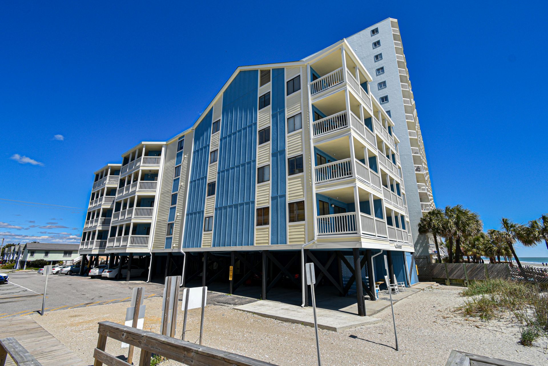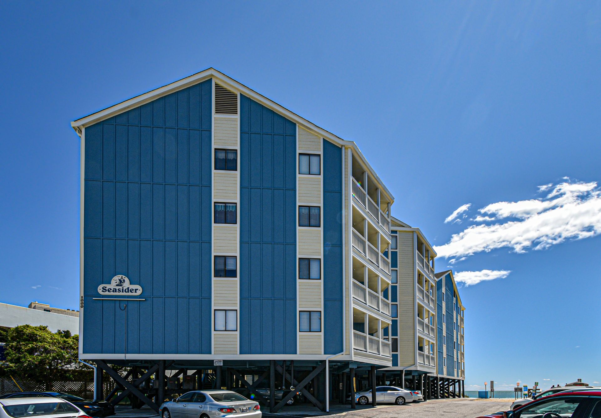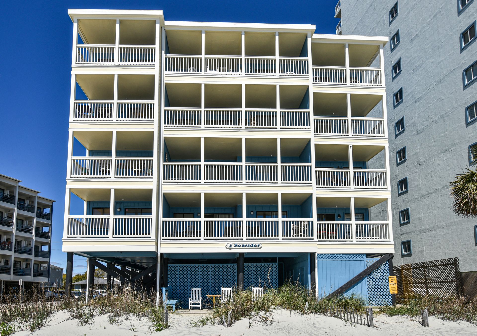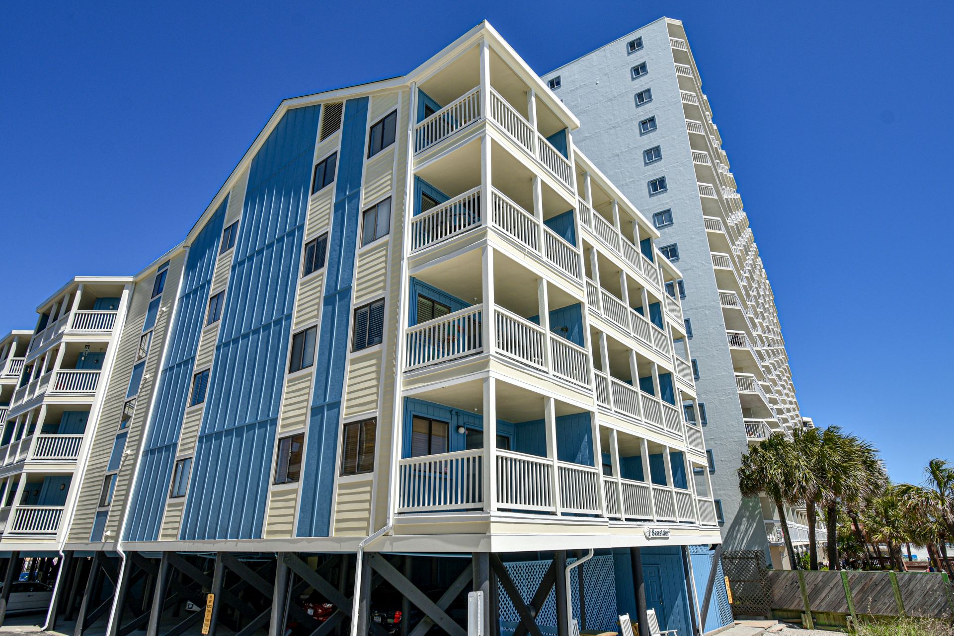Seasider is an oceanfront complex comprised of two-to-three-bedroom, two-to-three-bath condo suites located 0.6 miles north of Garden City Pier. Standard unit features include a fully-equipped kitchen, central heat and air conditioning, balcony, and ocean views. Other interior features and amenities vary per unit. Complex amenities include an elevator. No pool. Parking is limited. No trailers. No golf carts. No pets. No smoking. Check-out maid service included.